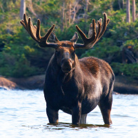 natural habitat, standing in shallow water along the bank of a lake. The moose has
