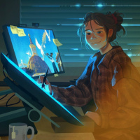 a young woman with brunette hair sitting at her computer desk. She appears to be focused on the screen in front of her, which shows what seems to be