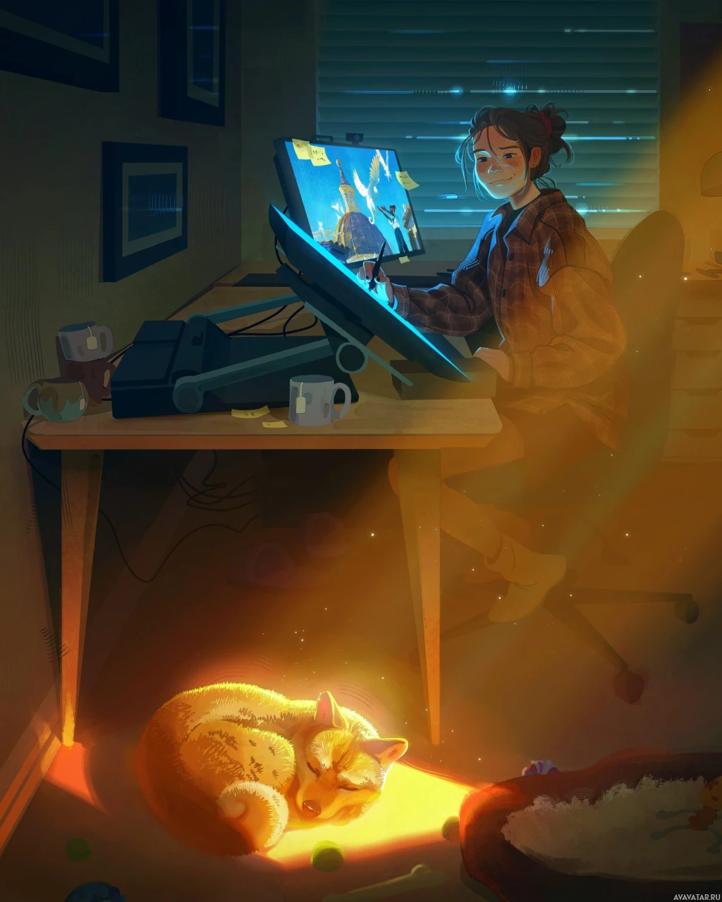 an online game or a chat window. To her right is a cat lying on the floor, and there are