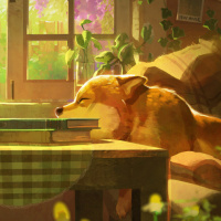 a cozy room with windows open to a lush garden outside. A dog is comfortably lying on a sofa in front of a table where a cup and some books are placed. The scene conveys
