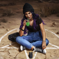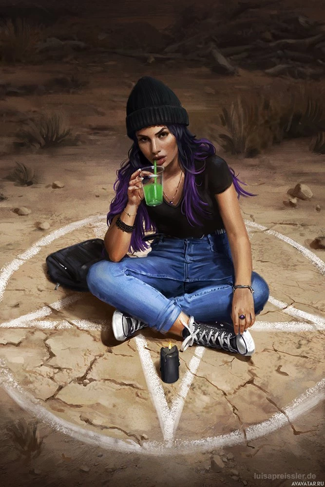 black top, and blue jeans, with sneakers. In front of her, there is a cup that she is holding and drinking from. On the ground around her, there are symbols resembling an inverted pentagram, which might suggest a thematic or symbolic connection to magic or