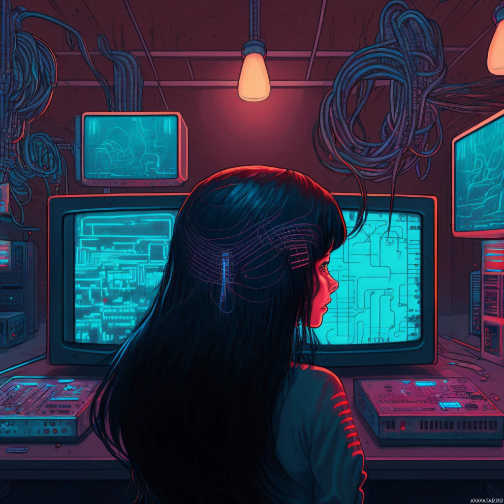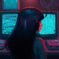 multiple screens displaying various electronic schematics or information graphics, which could indicate she's working on complex technical tasks. The overall aesthetic gives the impression of a modern, possibly