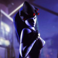 an urban environment that looks like it could be from the "Overwatch" universe. The character is well-known for her stealthy abilities, sniper skills, and