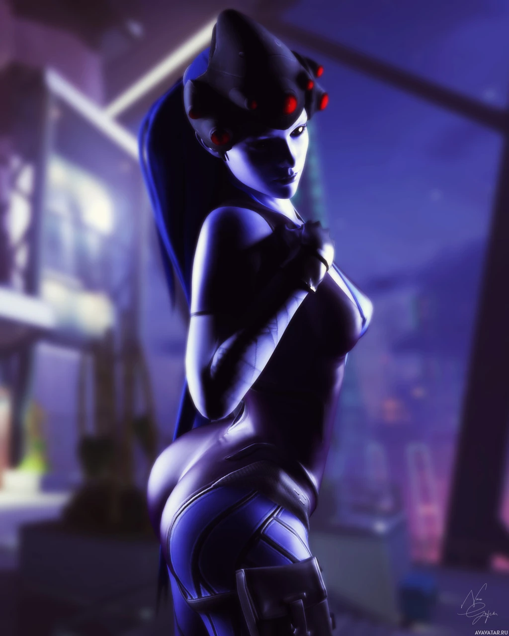 the video game "Overwatch." The character depicted here is Widowmaker, known for her blue and red outfit with a distinctive