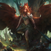forest setting. Her wings are spread out wide behind her, and she wears a garment that could suggest a warrior-like or battle-ready attire. The character's expression is one of determination or readiness for action. This image combines elements of fantasy with the symbolism often associated with