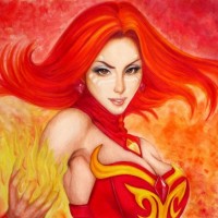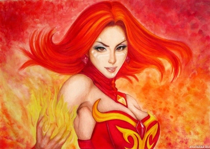 red hair and a fiery, dynamic pose. Lina is known for her flame-