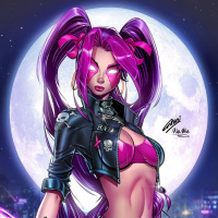a full moon, which suggests a night scene. There are also some lightning bolts around her hands, indicating she might have