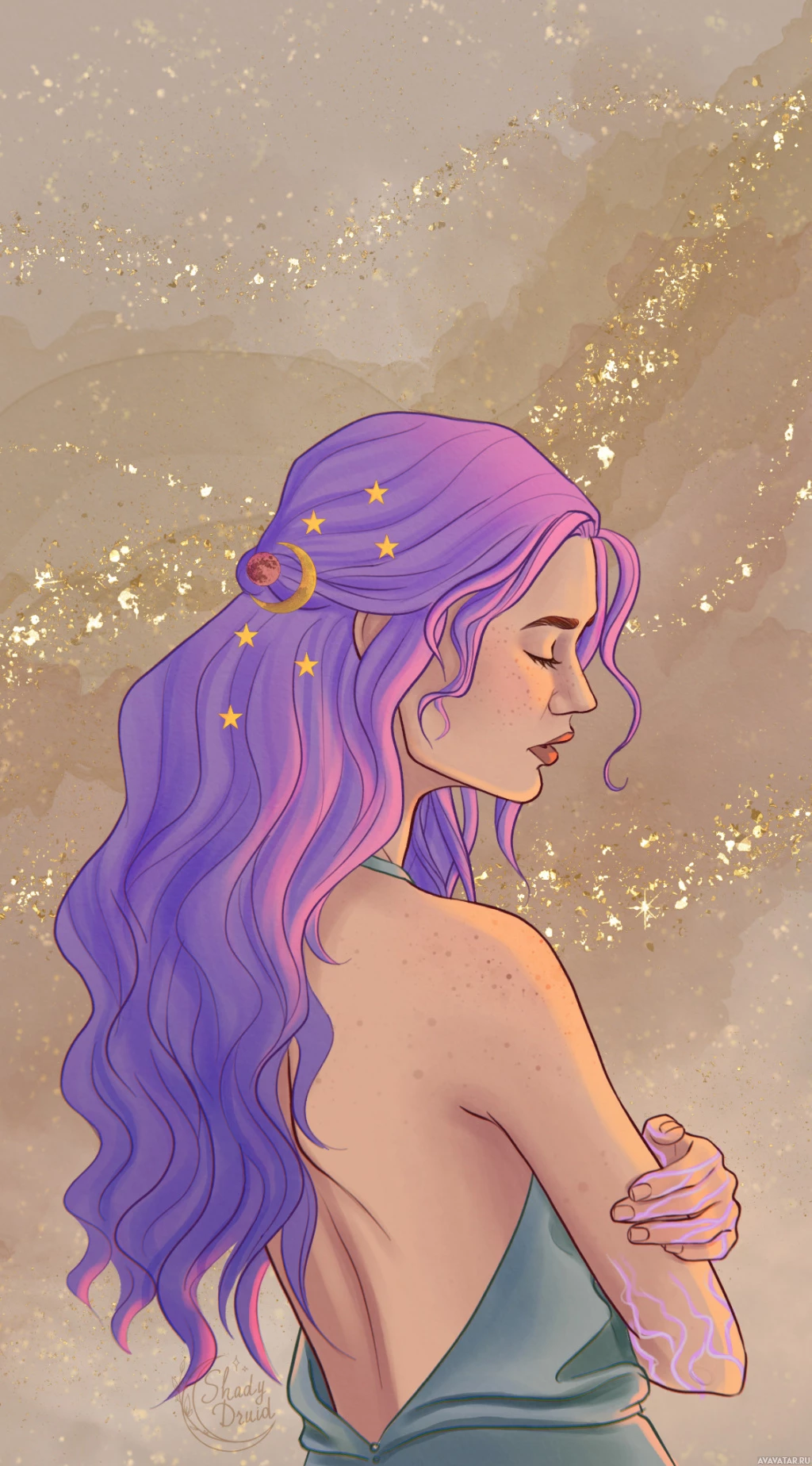 На картинке женщина изображена сзади, с закрытыми глазами. У нее длинные фиолетовые волосы, и одета она во что-то похожее на струящуюся одежду или платье с верхом без рукавов. На заднем плане изображено звездное небо и золотые искры, которые создают впечатление волшебной или причудливой обстановки.