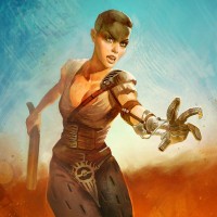 This image depicts a character known as Furiosa from the movie "Mad Max: Fury Road". She is portrayed in an action pose, with her arm outstretched and a determined expression on her face. The background suggests a desert-like environment, which aligns with the setting of the movie.