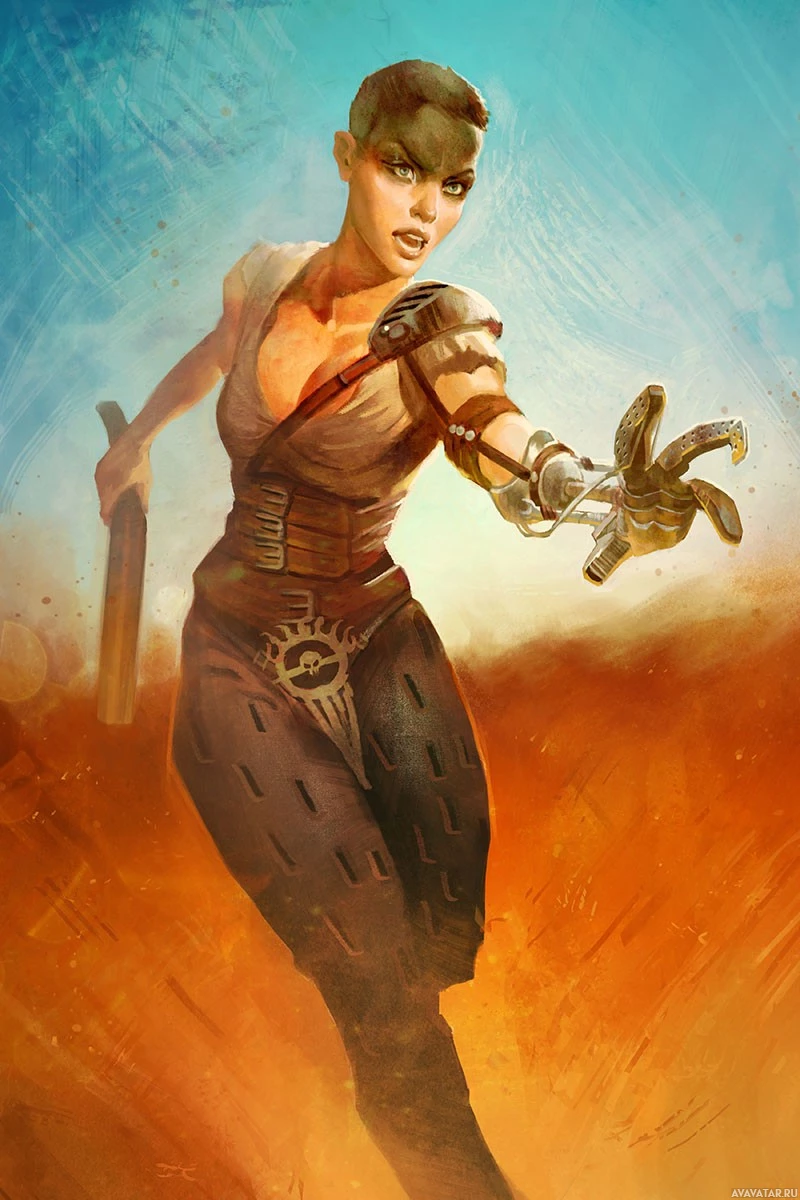 На этом изображении изображен персонаж, известный как Фуриоза из фильма «Безумный Макс: Дорога ярости». Она изображена в боевой позе, с вытянутой рукой и решительным выражением на лице. Фон предполагает пустынную среду, которая соответствует обстановке фильма.
