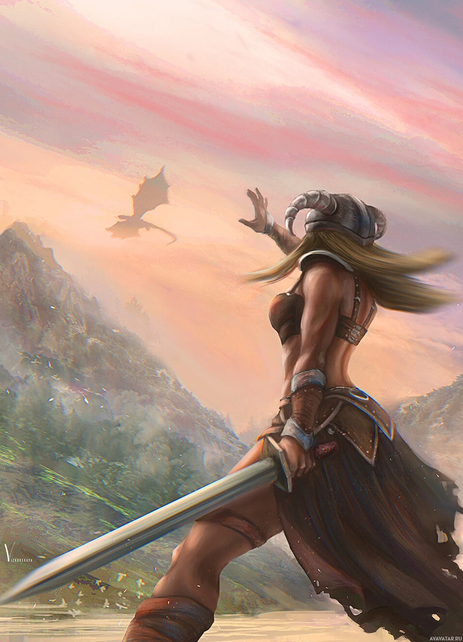 a colorful sky at either sunrise or sunset, adding a dramatic and epic atmosphere to the scene. The character's posture suggests motion, possibly indicating that she is running or charging into battle.