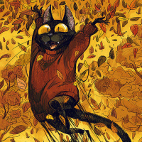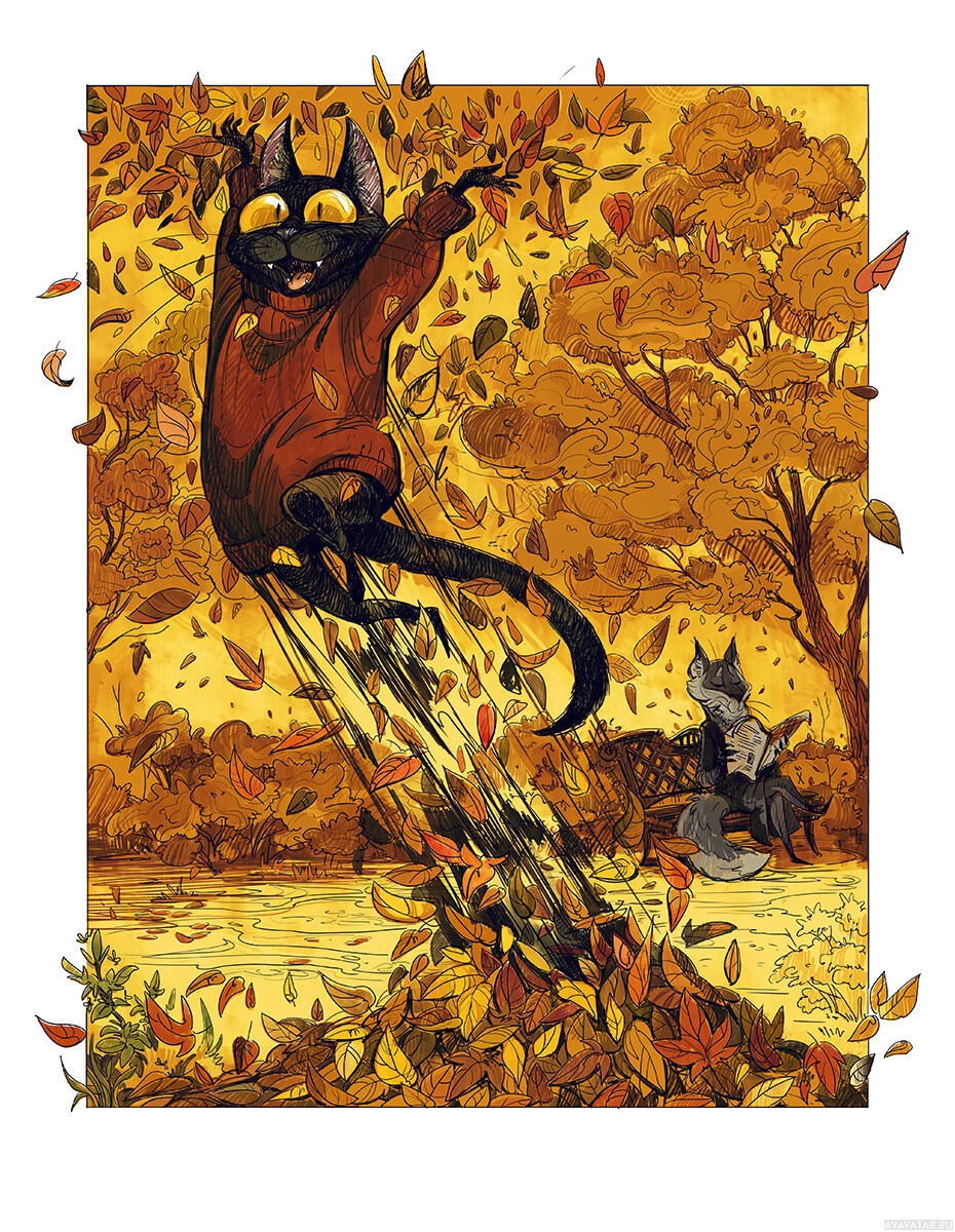 cat on the ground looking up at the airborne cat, and there appears to be an owl nearby, observing the scene. The color palette suggests a fall setting, indicated by the golden yellow foliage and