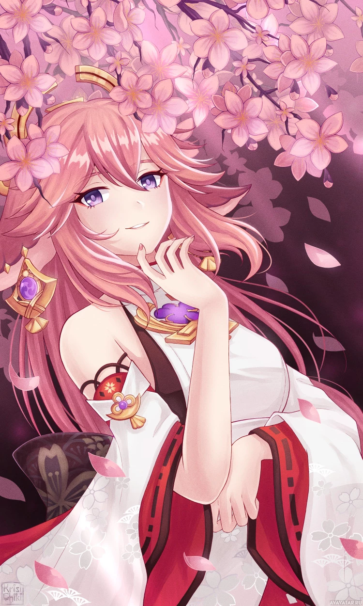 Genshin Impact named Yae Miko. She is depicted in her white and pink outfit with