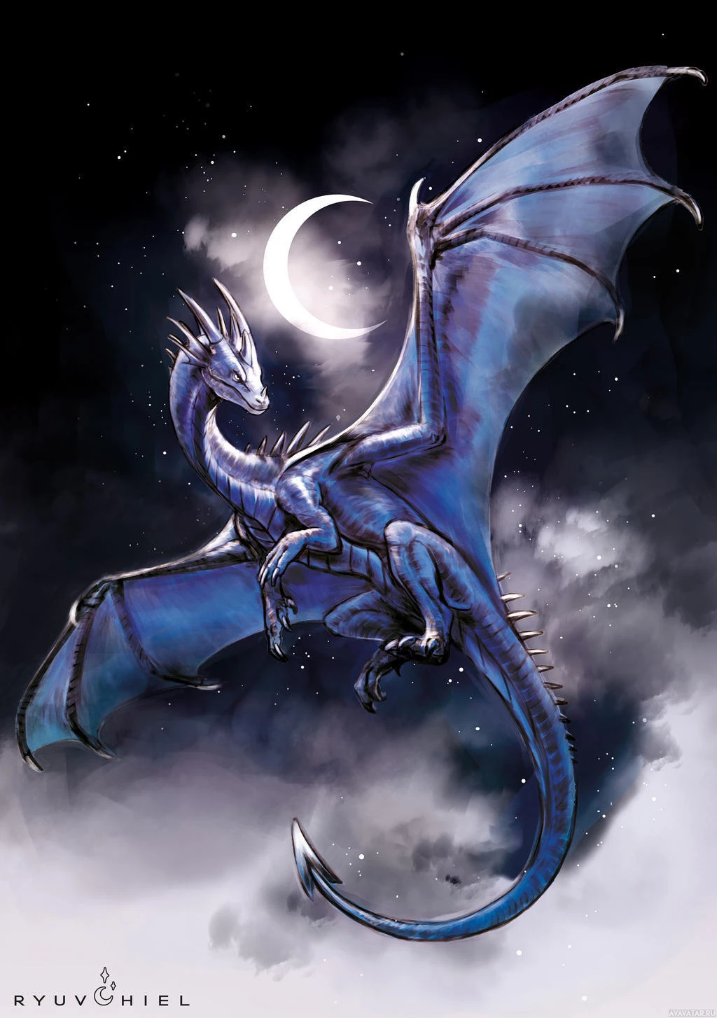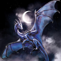 a fantasy dragon. The dragon has blue scales and is depicted in flight, with its wings spread wide against a night