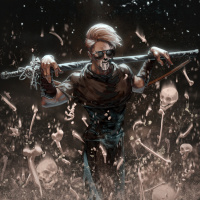 a leather jacket, and he is holding a large weapon that could be a hammer or a similar type of armament. The background is dark and moody, with the silhouette of