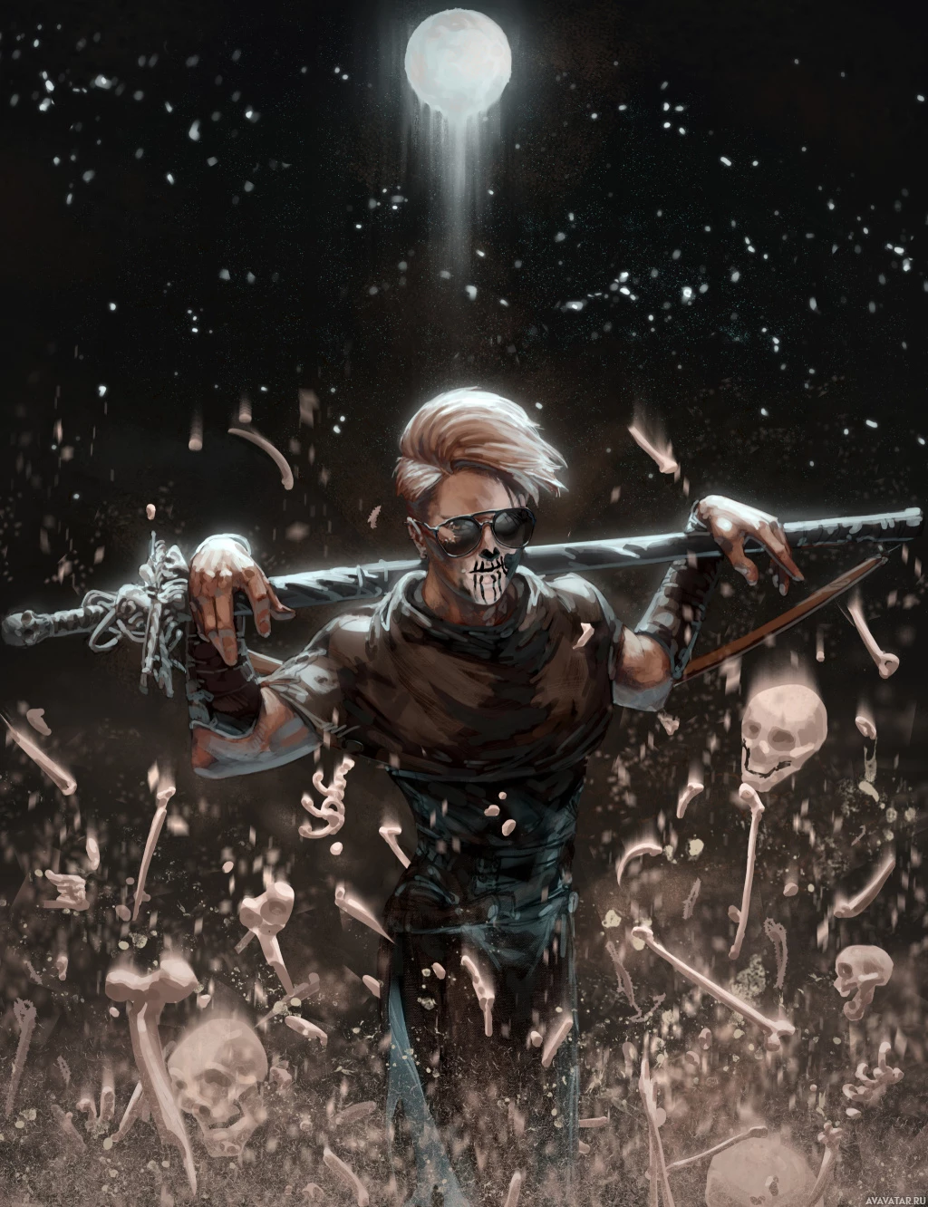 a crescent moon on the left side. There are also several skulls scattered around him, which could suggest