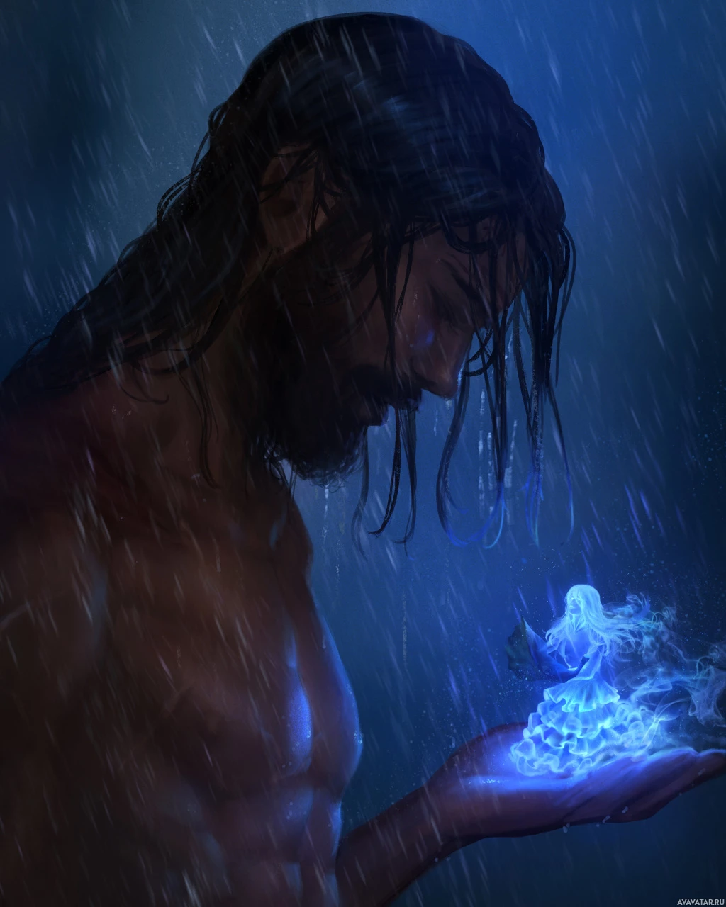 long hair and a beard, and he appears to be deep in thought or possibly contemplating something significant. In his hand, he holds a glowing blue crystal or