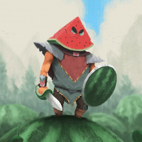 the unusual headgear made of watermelon, giving them a unique and humorous appearance. The character is also wearing