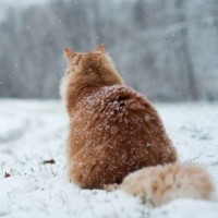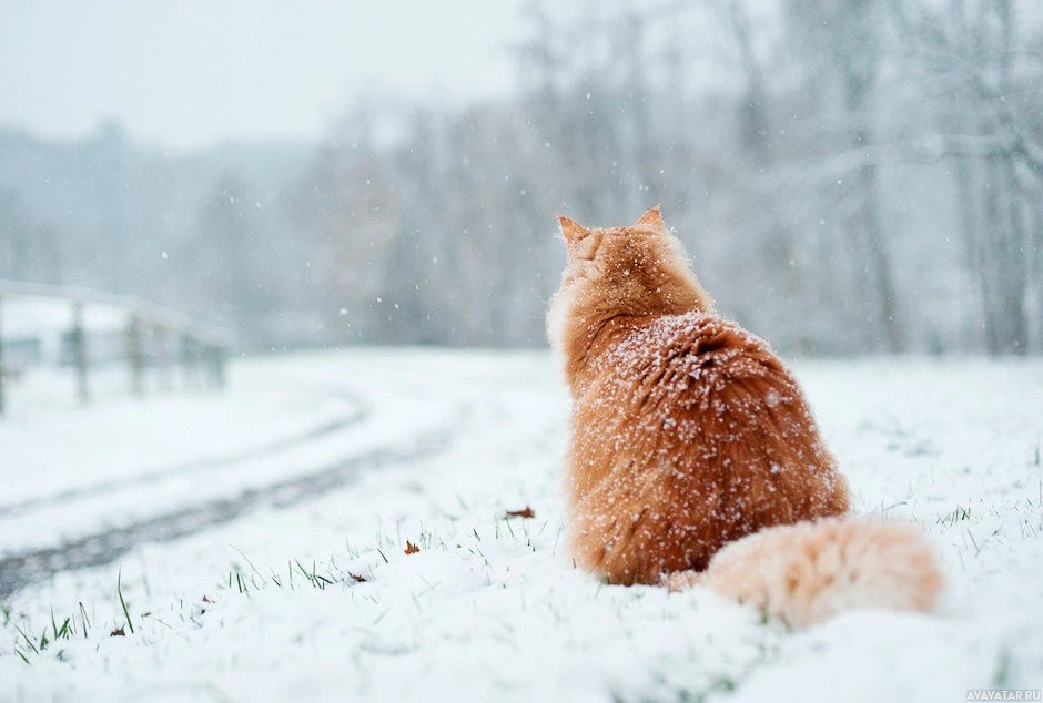 На снимке изображен кот, сидящий на земле, глядя в сторону камеры. Кошка, по-видимому, находится в снежной среде со слегка размытым фоном, который предполагает выпадение снега или зимнюю обстановку.