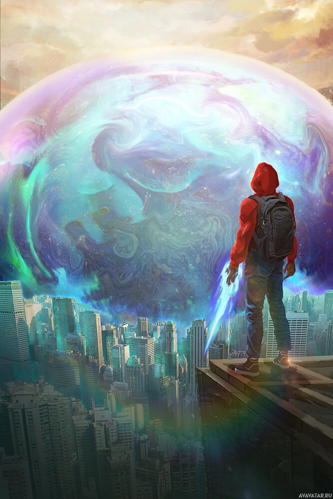 hooded jacket and appears to be in a contemplative or alert stance, as if they are observing something below. In the background, there's an enormous sphere that resembles a planet or moon with