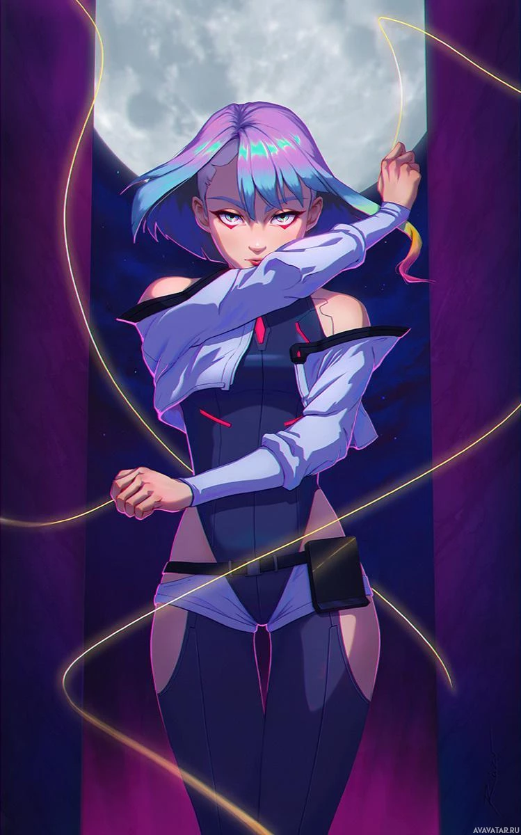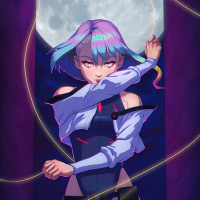 an animated character who appears to be styled in a cyberpunk fashion. This character has distinctive