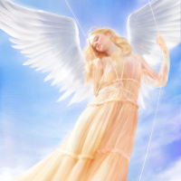 The image shows a depiction of an angel with wings and a halo. She has