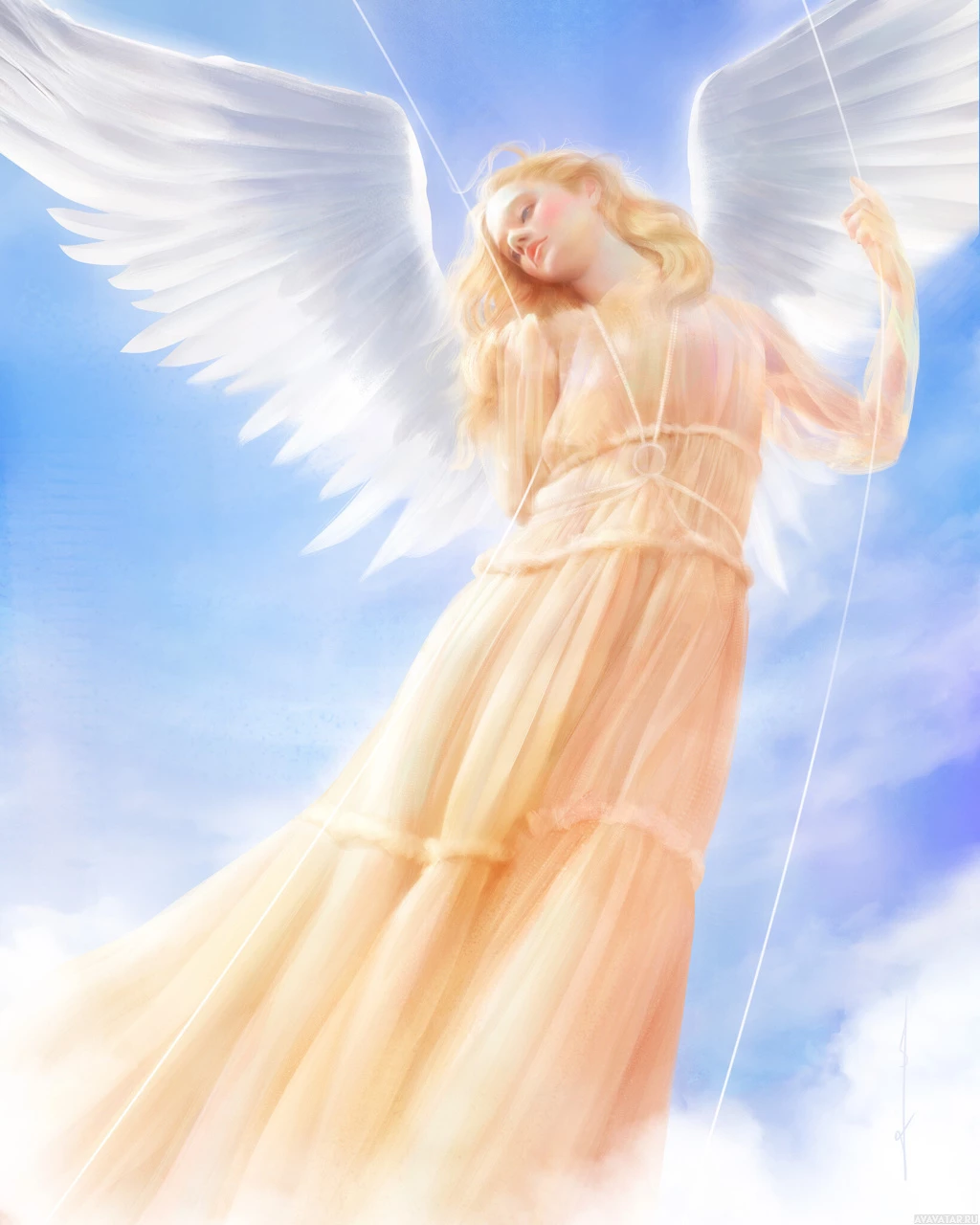 blue sky, which contributes to the serene and ethereal atmosphere of the illustration. This type of image would be associated with fantasy themes, particularly those involving religious or supernatural elements.