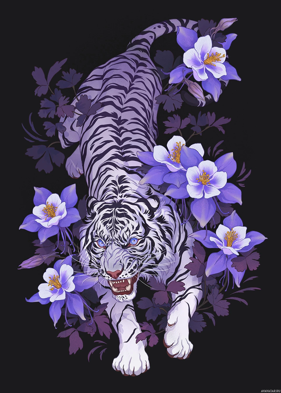 a realistic portrayal, capturing the muscles and features of the animal. Surrounding the tiger are flowers with purple petals and