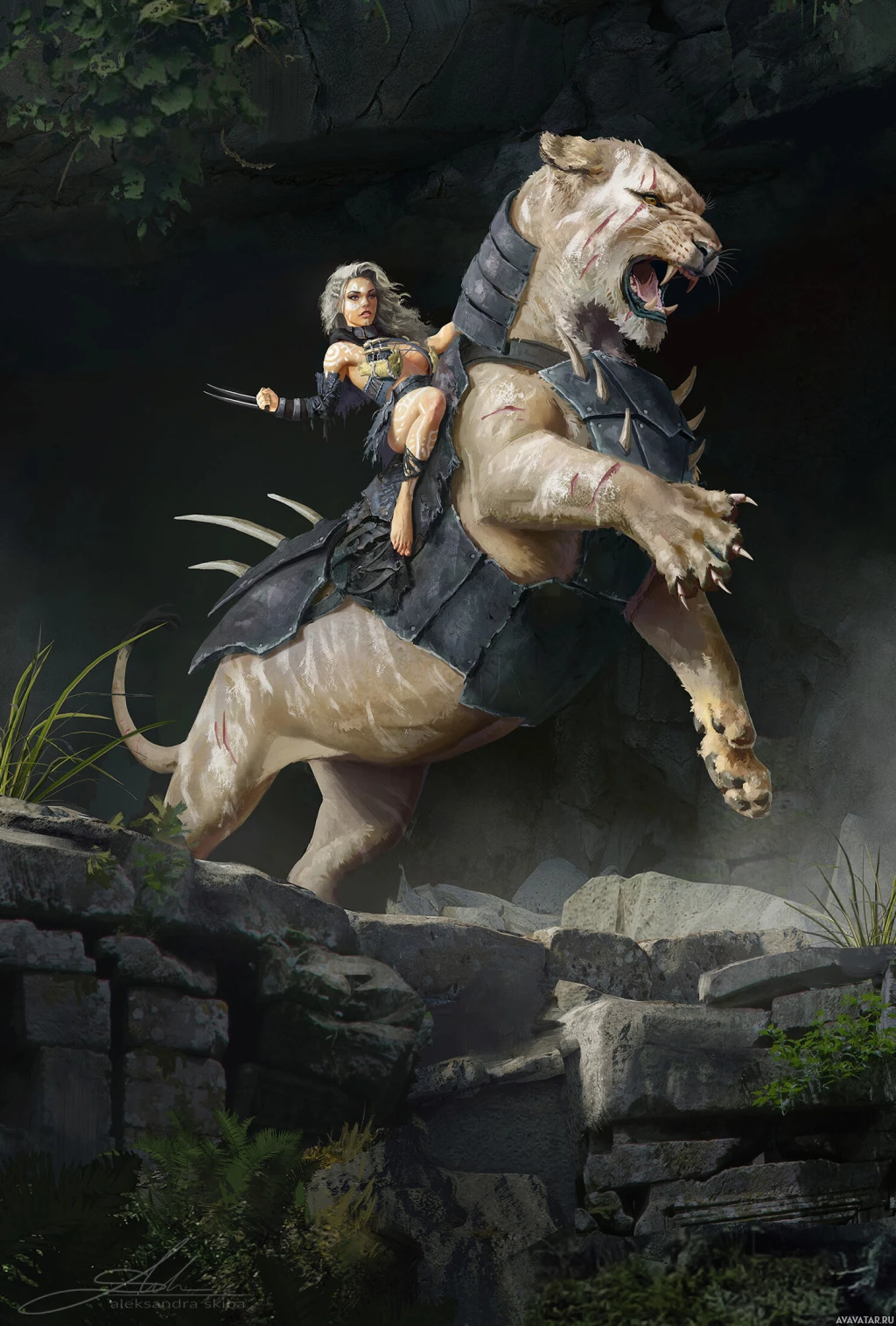 a fantasy scene where a girl with white hair is riding on the back of an animal that resembles a lion. They are situated in what appears to be a rocky or mountainous environment, and the creature is displaying