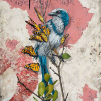 a blue jay. It is perched on a branch with some foliage around it, and there are other birds depicted in