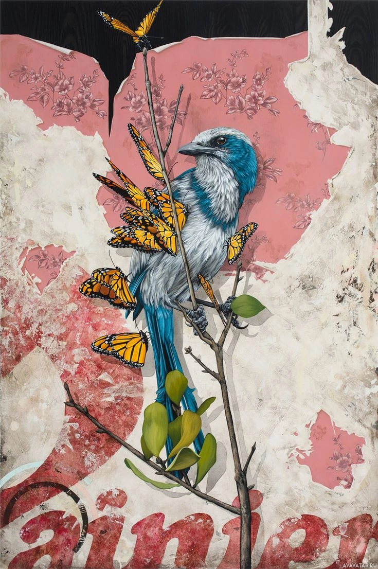various stages of flight or landing nearby. The background includes abstract elements and what appears to be the bottom portion of a soda can. There's also text that seems to be part of the artwork, but it's not fully visible from this angle. The overall style of the image is reminiscent of urban