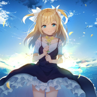 blonde hair, wearing a dress and holding what appears to be a flower. The character is set against a beautiful backdrop of sunset over the ocean, which suggests she might be enjoying