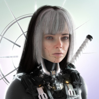 white hair and is wearing some sort of advanced technology-infused armor or suit. There are visible mechanical elements on the character's face and neck, suggesting