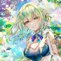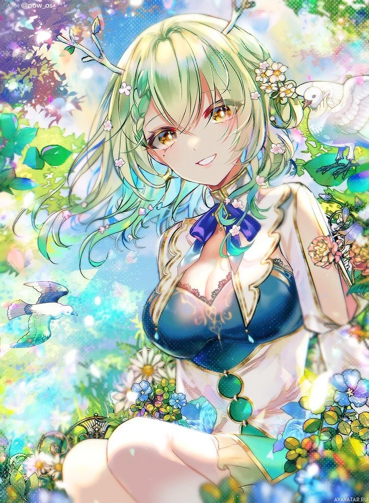 blonde hair with blue and pink highlights, and her eyes are red with slit pupils, giving her an otherworldly appearance. She is wearing what seems to be an aquatic or fantasy-themed outfit with a shirt, corset, and skirt that have