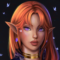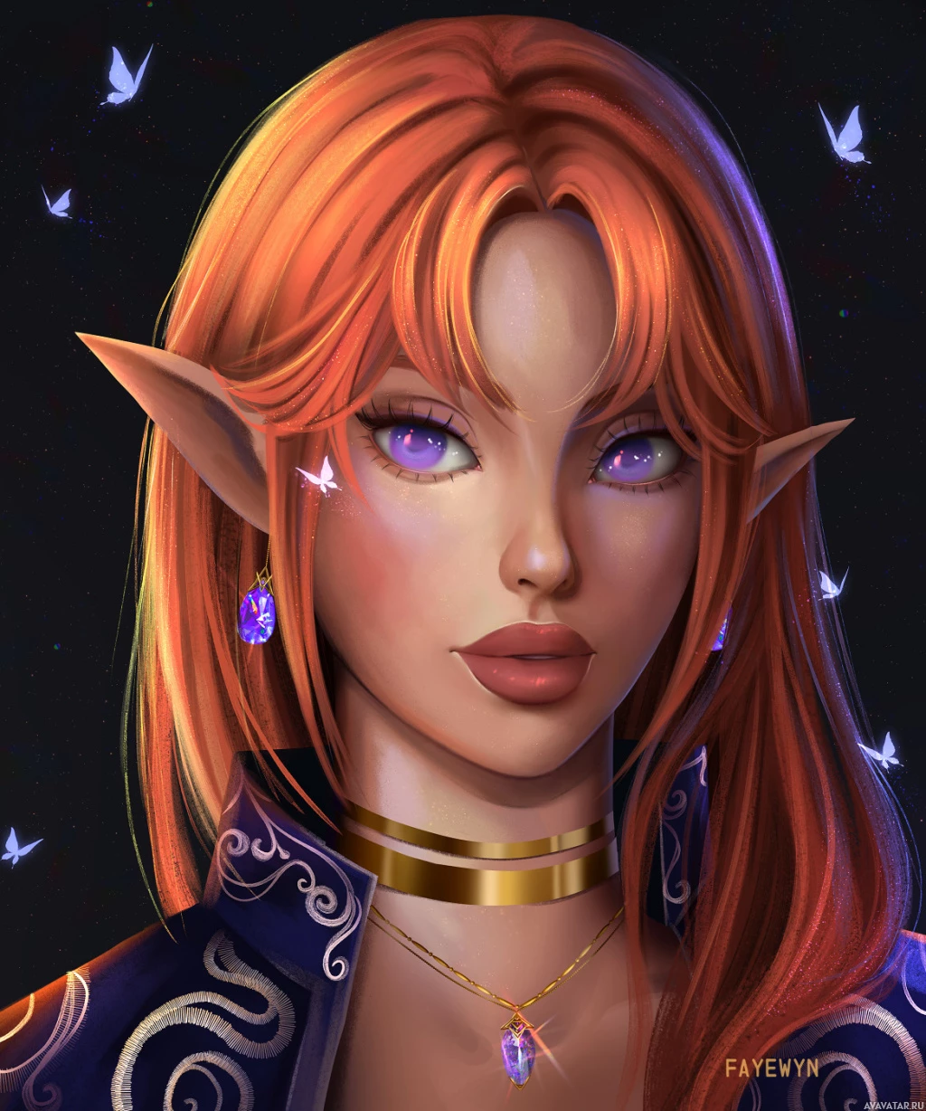a female character with red hair and pointed ears, commonly associated with elves in fantasy settings. She has striking purple eyes and is wearing what appears to be a blue garment with