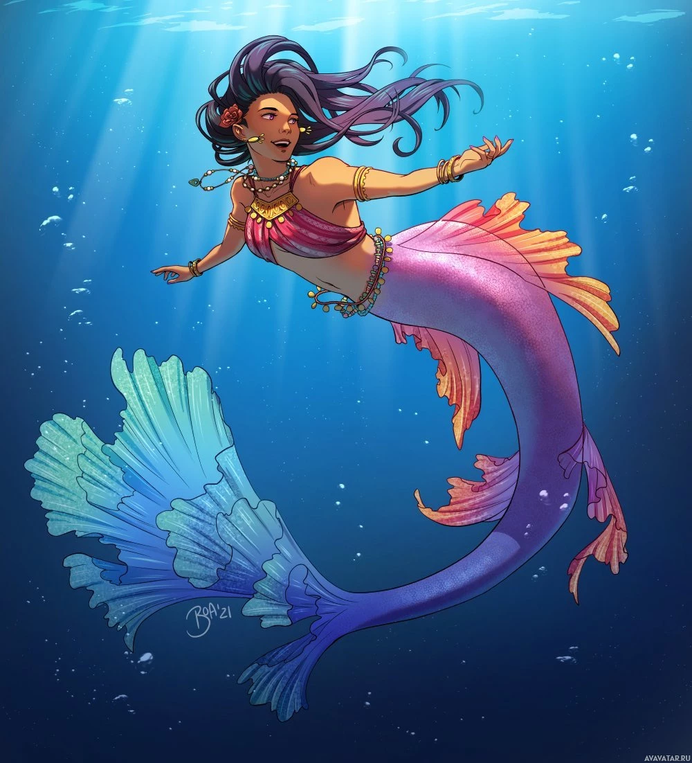 blue ocean with some seaweed visible at the bottom. This illustration is a fantasy-themed artwork that features a mermaid, which is