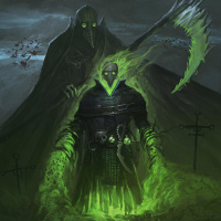 a supernatural being or a powerful sorcerer, as indicated by the ghostly green aura surrounding them and the skull held in their hand. They are dressed in robes that suggest a mystical or demonic presence, with symbols of crosses and
