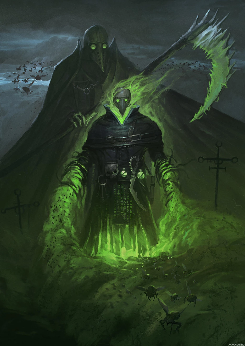 a plague doctor due to its large beak and overall menacing appearance. The character on the right appears to be