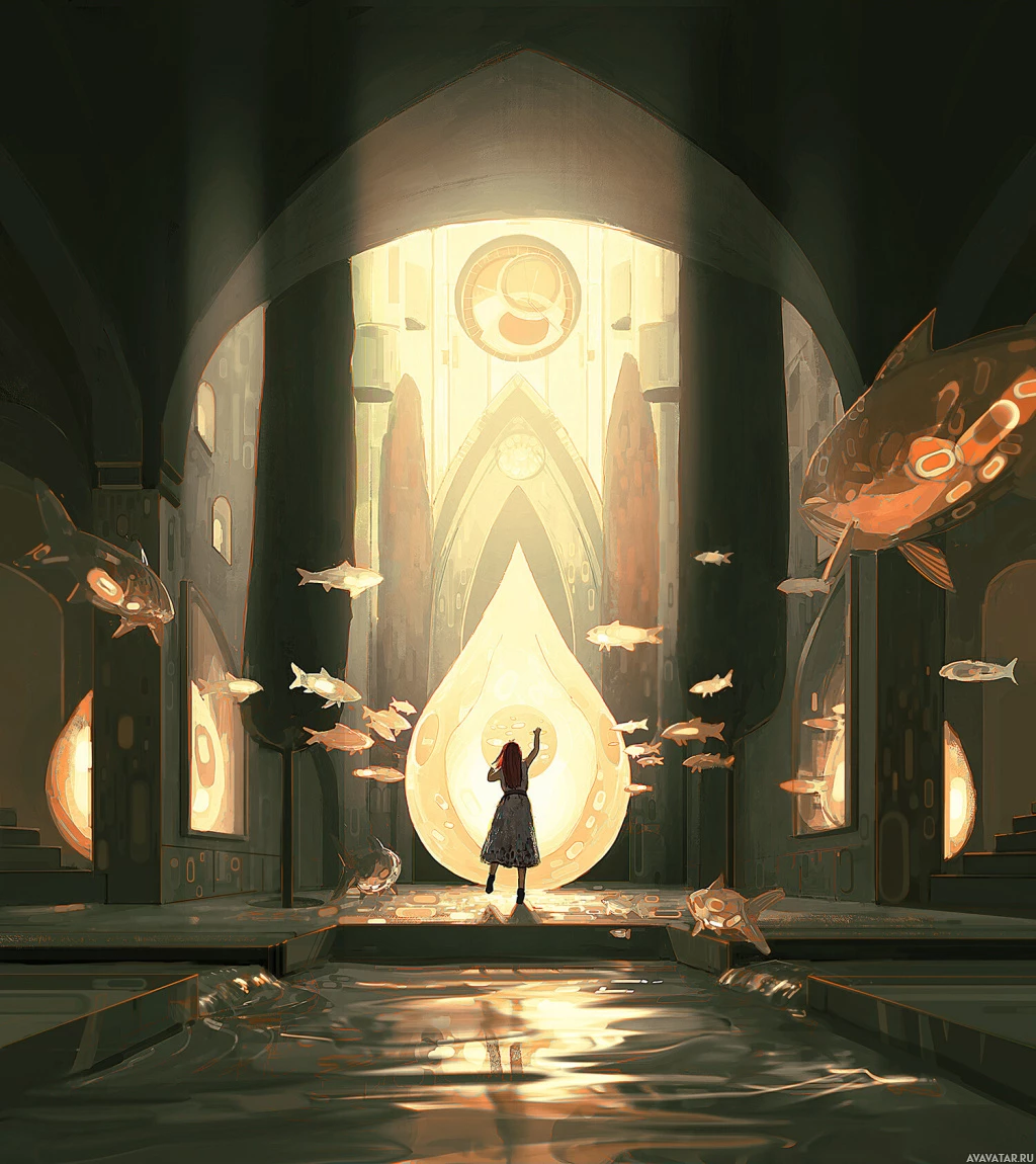 fish swimming in the air as if they are flying. The architecture and design elements suggest an ancient or mystical setting. There's no direct