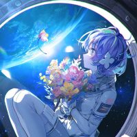 fantasy setting, as astronauts typically do not carry flowers while in space. The style is consistent with Japanese anime artwork.