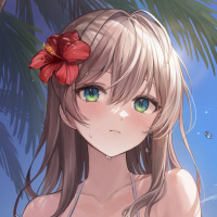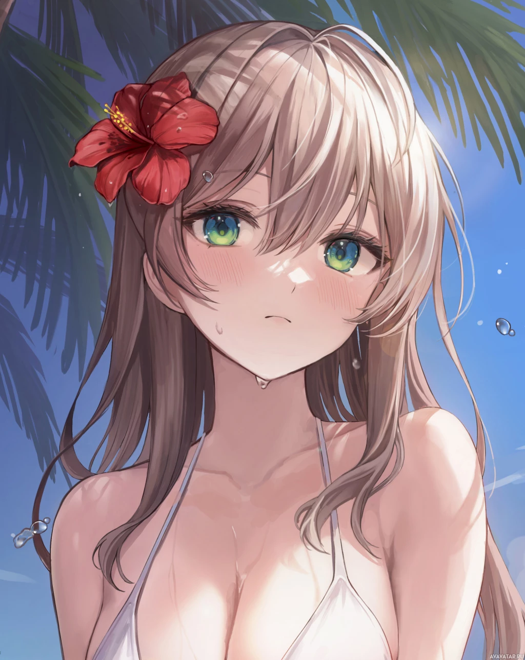 bikini top, and there's a red flower accessory in her hair, suggesting a tropical or beach setting. There are