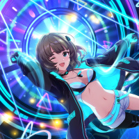 The image shows a female anime character. She appears to be in motion, possibly dancing or performing some sort of choreography with energetic background elements suggesting a performance or concert setting.