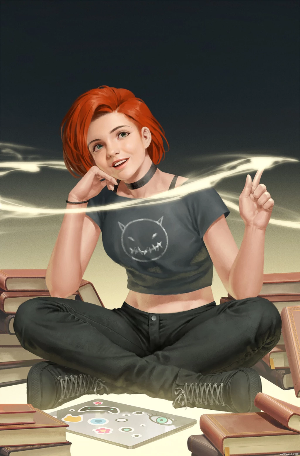На картинке изображена рыжеволосая женщина, сидящая, скрестив ноги, на земле перед стопкой книг. Кажется, что она занята каким-то занятием, связанным с книгами или альбомом для рисования. Она улыбается и выглядит довольной, возможно, ей нравится проводить время, погруженная в то, что она делает.
