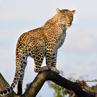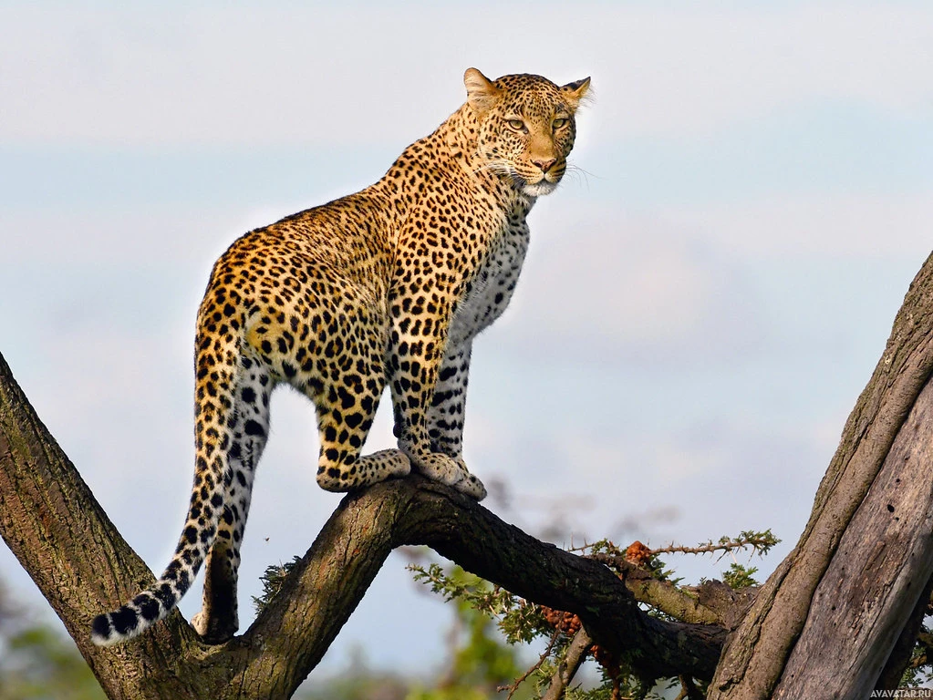 На картинке изображен леопард, сидящий на ветке дерева. Леопард смотрит прямо в камеру, прижав уши, что может свидетельствовать о настороженности или потенциальной агрессии. Похоже, он находится в своей естественной среде обитания, возможно, в саванне или лесу.