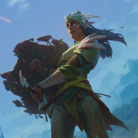 The image features a fantasy-themed character, resembling an elf. The character is holding a staff and appears to be in a combat or adventurous stance amidst what looks like