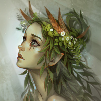 green leaves and twigs on her head and is shown gazing into the distance, possibly representing a contemplative moment or connection with nature. The art style is detailed and vivid, highlighting the character's