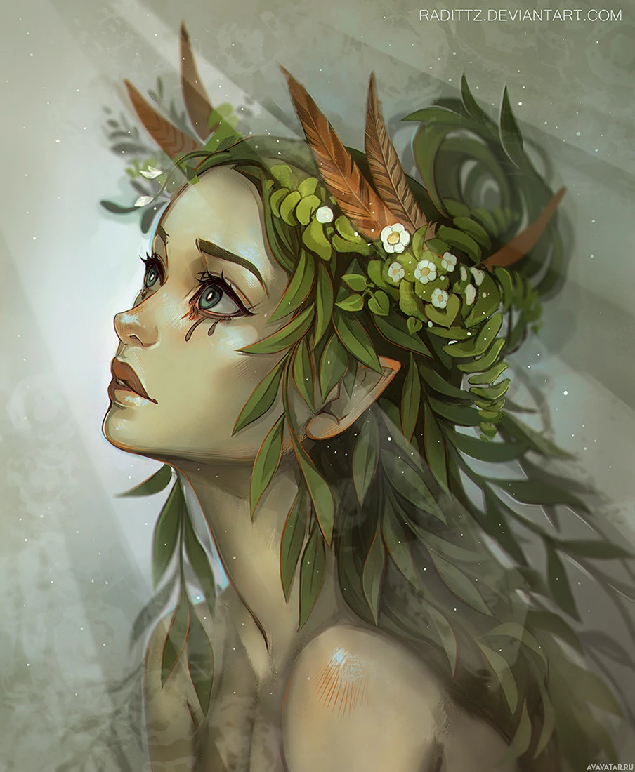 a fantasy character. The character appears to be a dryad, which in mythology refers to a nymph associated with trees and often depicted as having the upper body of a human and lower body made up of