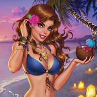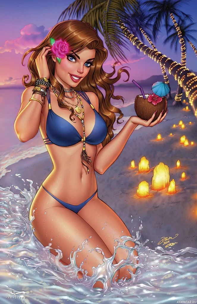 palm trees, a starlit sky in the background, and a gentle wave splashing around her.