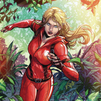 book character in an action pose. She is wearing a red and black outfit, which might suggest she is part of the fantasy or superhero genre. The setting appears to be a dense jungle with