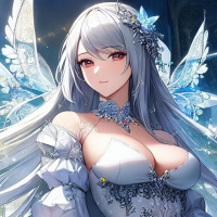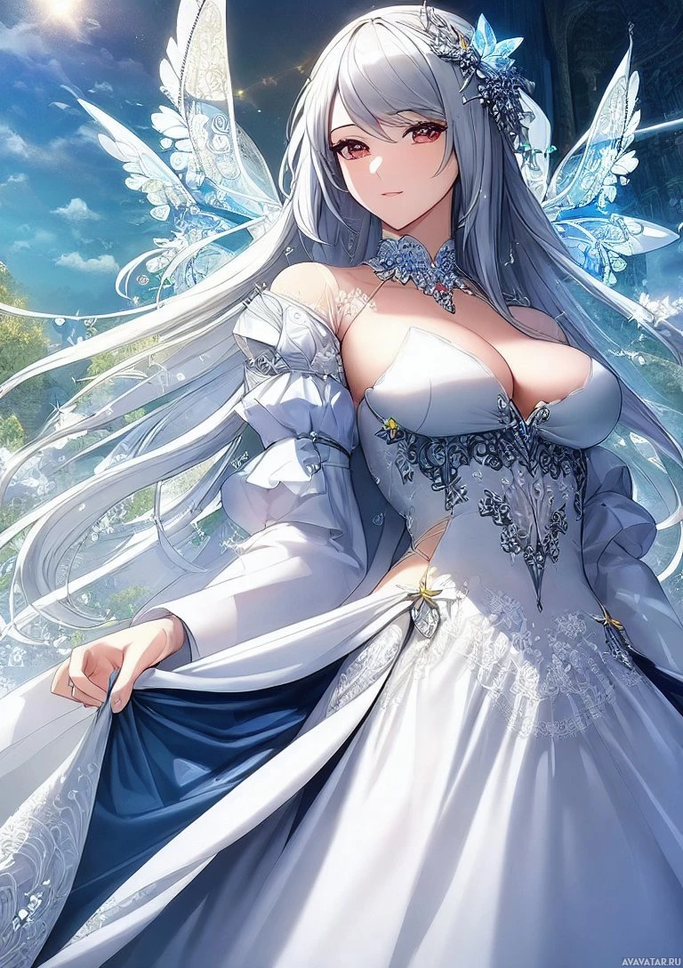 white hair. She is wearing a fantasy-style dress that could be described as "